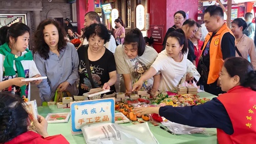 残疾人手工艺义卖区展卖布艺、编织、绘画等精美手工艺品,吸引众多市民驻足选购,让爱心在互动中传递,让平等共融的理念在实践中生长。