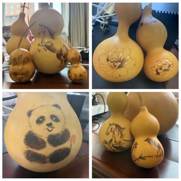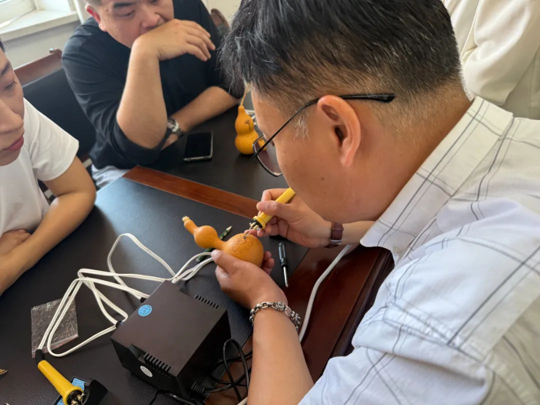 本次培训以“理论筑基+技法精进+创意转化”构建系统化教学体系。文化溯源环节,非遗传承人梳理葫芦烙画从汉代“熨帖”工艺到现代文创的千年脉络,通过历代珍品解析“葫芦即福禄”的文化内涵;技法教学中,老师以电烙铁为笔,详解温控、线条顿挫与墨色层次技巧,通过示范让学员掌握“铁笔生花”的核心技法;创意设计课融入国潮元素与地域文化符号,指导学员根据葫芦形态设计“福禄双全”“山水写意”等主题图案,推动传统技艺与当代审美融合。