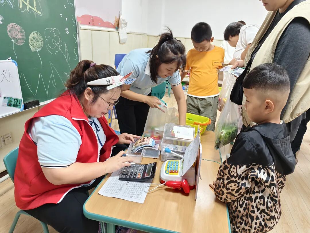 活动过程中,孩子们在教师们扮演的“导购员”和“收银员”的耐心引导下,有序地参与到“选购商品”“辨认价格标签”“计算金额”“支付钱币”及“找零核对”等多个环节中。