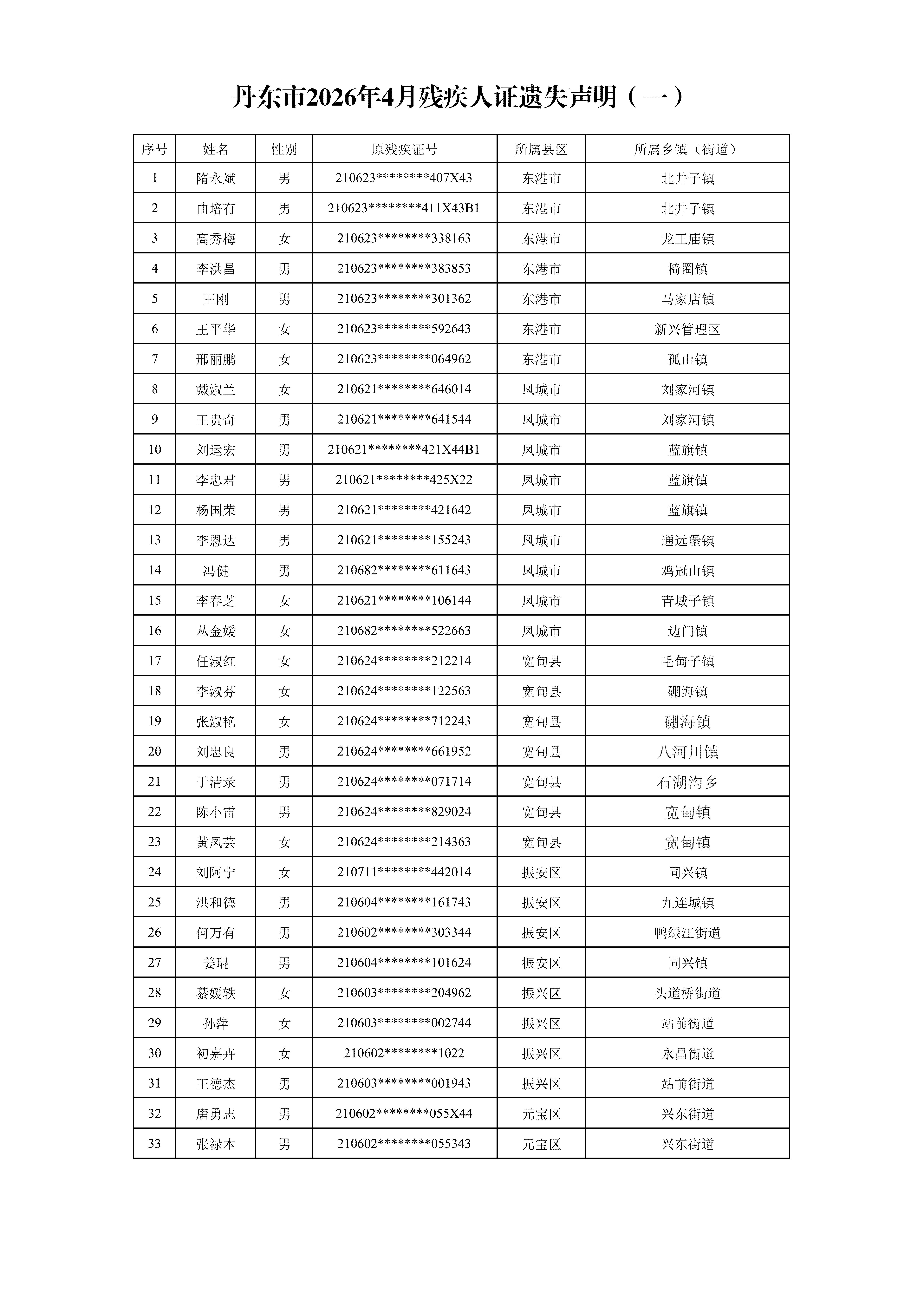 根据《<中华人民共和国残疾人证管理办法>丹东市实施细则》(丹残联发〔2018〕7号)相关规定,现将2026年4月全市第一批残疾人证遗失人员名单公示如下: