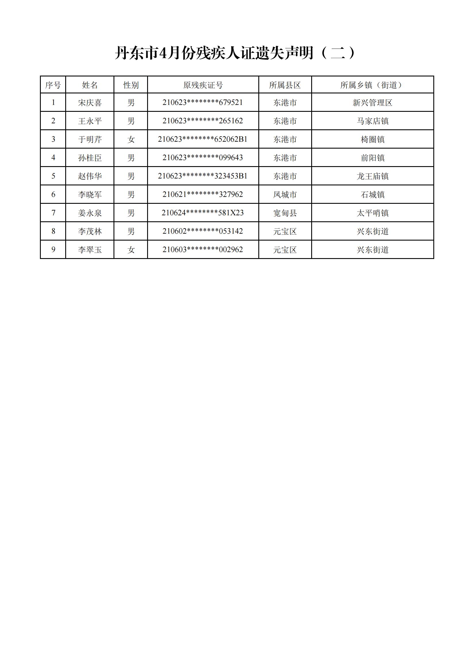 根据《<中华人民共和国残疾人证管理办法>丹东市实施细则》(丹残联发〔2018〕7号)相关规定,现将2025年4月全市残疾人证丢失补办第二批人员名单公示如下: