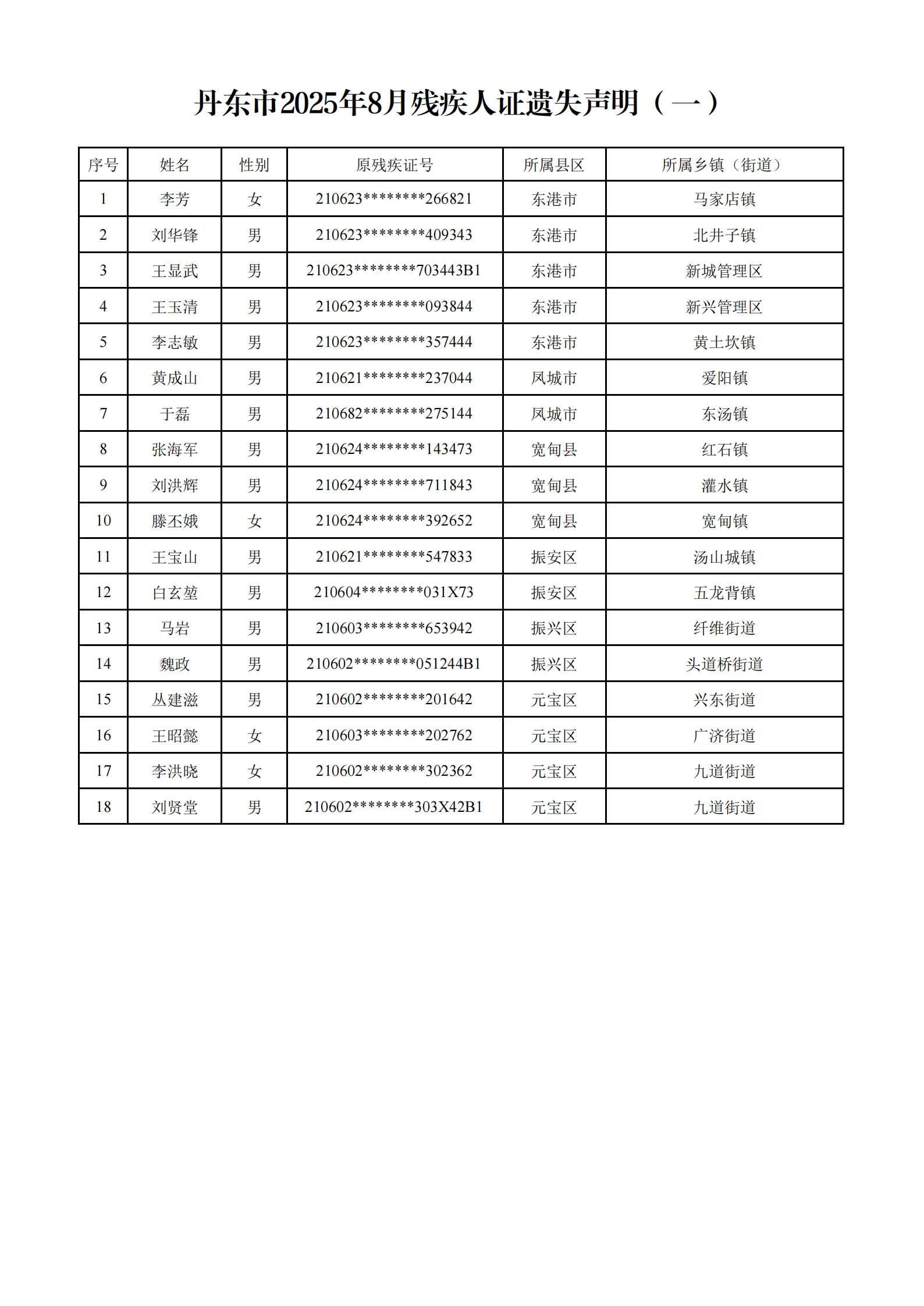 根据《<中华人民共和国残疾人证管理办法>丹东市实施细则》(丹残联发〔2018〕7号)相关规定,现将2025年8月全市第一批残疾人证遗失人员名单公示如下: