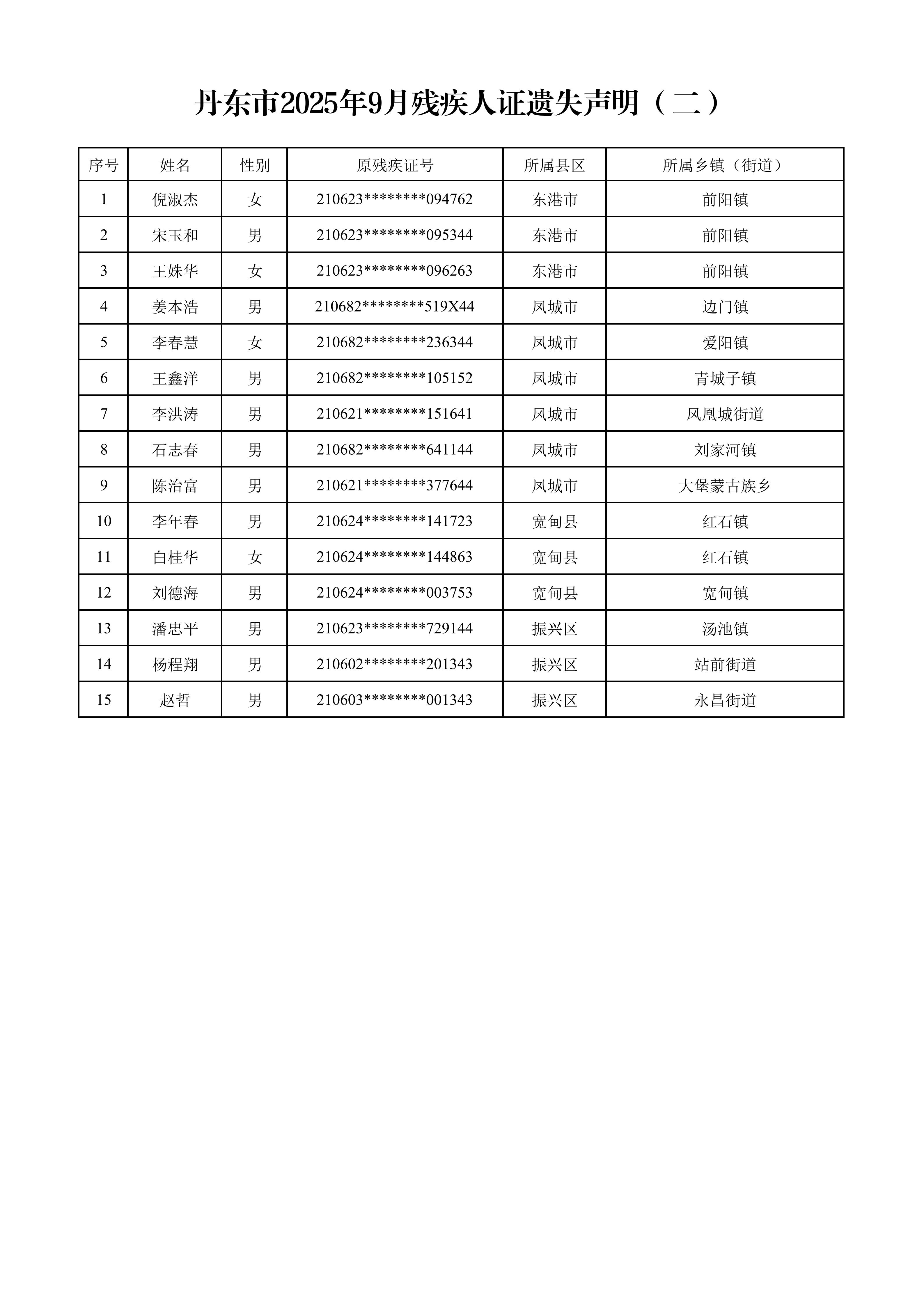 根据《<中华人民共和国残疾人证管理办法>丹东市实施细则》(丹残联发〔2018〕7号)相关规定,现将2025年9月全市第二批残疾人证遗失人员名单公示如下: