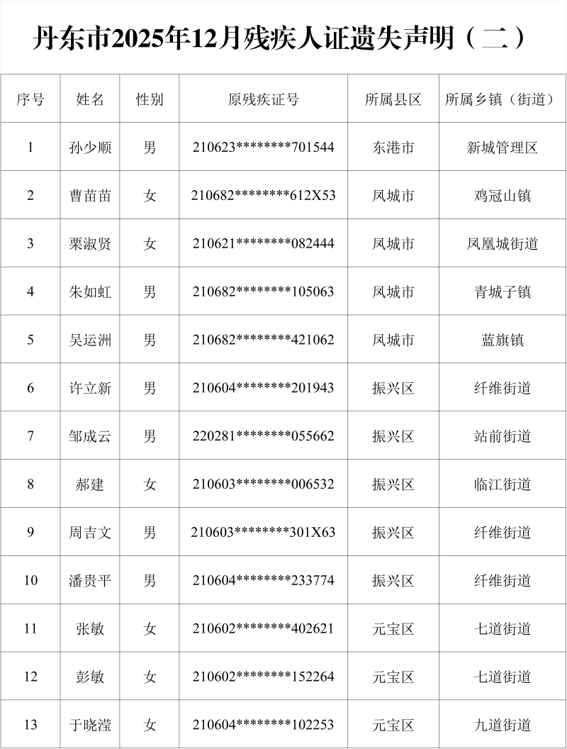 根据《<中华人民共和国残疾人证管理办法>丹东市实施细则》(丹残联发〔2018〕7号)相关规定,现将2025年12月全市第二批残疾人证遗失人员名单公示如下: